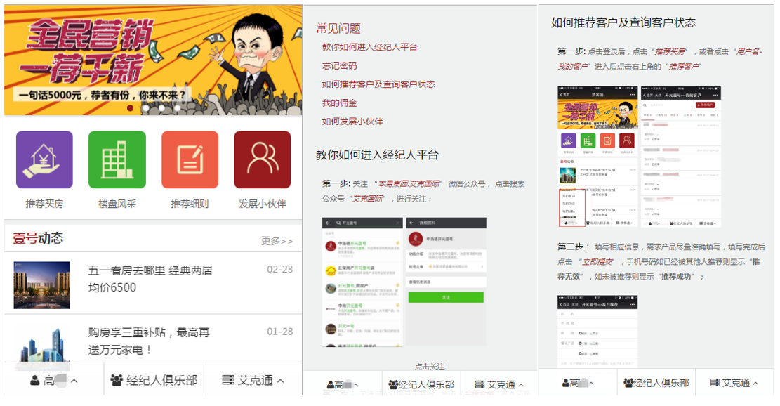 客戶注冊(cè):擁有微信并關(guān)注公眾號(hào),即可注冊(cè)申請(qǐng)成為全民營(yíng)銷(xiāo)系統(tǒng)的用戶(全民經(jīng)紀(jì)人)。注冊(cè)用戶可隨時(shí)通過(guò)微信查看已經(jīng)推薦的客戶信息、購(gòu)房進(jìn)度、傭金結(jié)算情況。